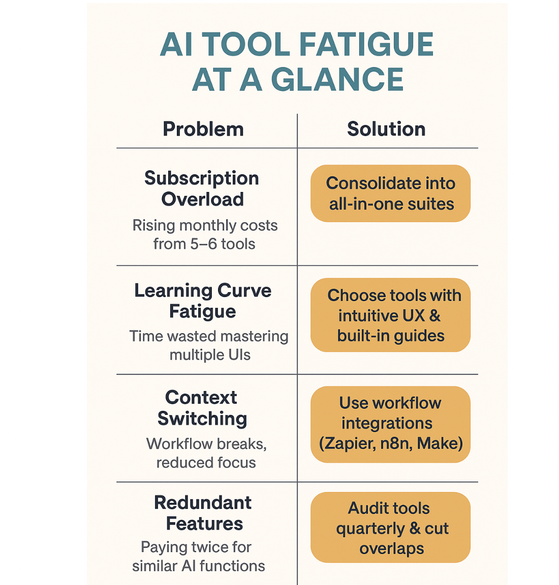 The next phase of the AI revolution won’t be about more tools. It will be about better orchestration, fewer subscriptions, and platforms that truly simplify work. Until then, AI tool fatigue might be the hidden cost of living in the AI age.
