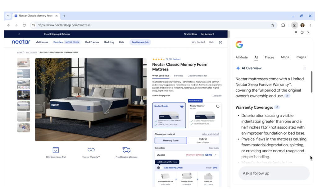 • AI Side Panel: While browsing, open the Gemini panel to summarize, explain, or expand on what you’re seeing.