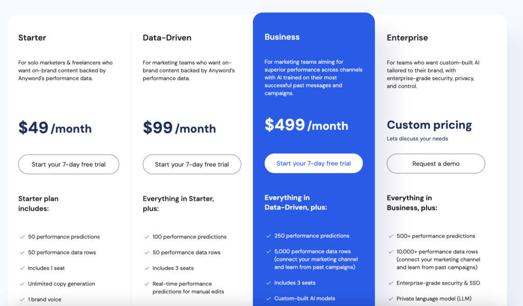 Anyword is an AI writing tool built for data-driven marketers and performance-focused campaigns. Its unique selling point is predictive performance scoring, which is an AI-based metric that estimates how your content will perform before publishing. The platform also allows marketers to train the AI using existing brand assets to better match tone and voice. With a focus on conversion and ROI, Anyword is a standout for those who want more than just content—they want measurable results.