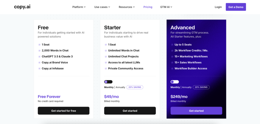 Copy.ai: It shines with its intuitive UI and a broad range of templates for product descriptions, social posts, and more. With a free plan and team features, it’s a handy tool for anyone wanting quick, catchy copy with minimal effort.