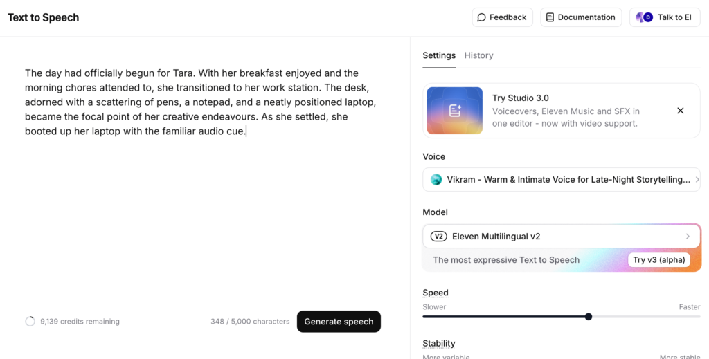 ElevenLabs is best known for its ultra-realistic TTS. I tried multiple scripts across English and Hindi, and the voices felt fluid, expressive, and lifelike. It is arguably more natural than most competitors. Even on the free plan, the quality was impressive, though usage is capped by a limited character allowance. For creative and professional projects, this sets a high bar.