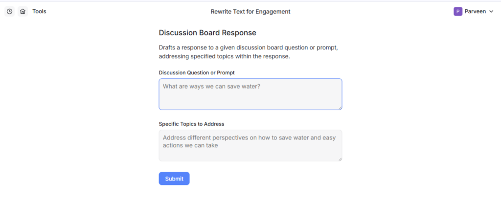 - Discussion Board Response → Great for students—produces thoughtful responses to questions, allows re-editing, and supports word limits for precision.