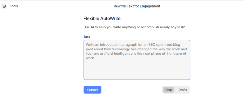 - Flexible Autowrite → Generates blog paragraphs or posts in seconds with impressive flow and clarity.