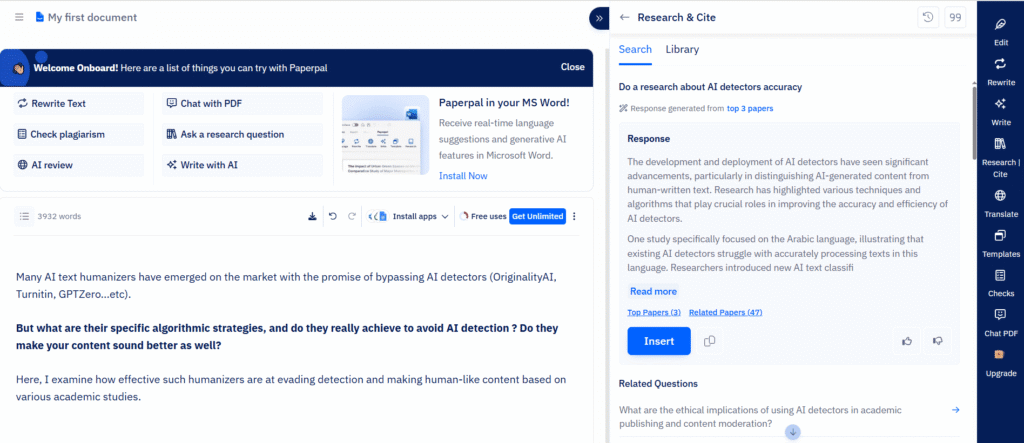 Paperpal AI emerges as a potent writing assistant that strikes an impressive balance between academic rigor and everyday usability. Its standout features like rewriting with nuanced tone adjustments, plagiarism checks with source tracking, detailed AI-led structural reviews, and research question responses position it as more than just a regular “text generator.” Instead, it acts as a smart editor, researcher, and writing coach combined.