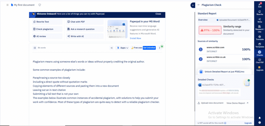 Even on the free plan, Paperpal provides enough room to test core functions like rewriting, plagiarism checks, and research assistance. However, its true potential unfolds with the Prime Plan, which unlocks unlimited rewriting, detailed plagiarism reports, AI-based review, and advanced citation tools.