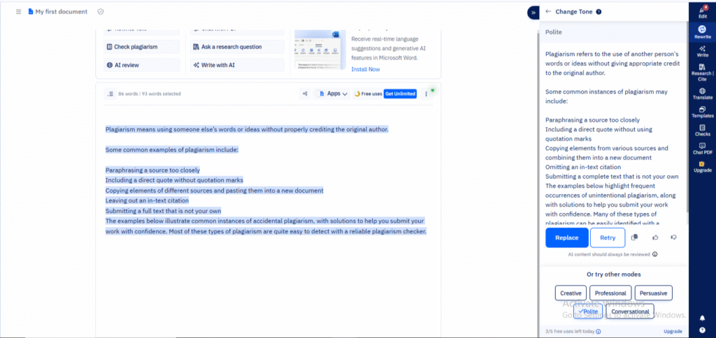 This tool gives your text the ability to speak in the right voice. With tone options like polite, professional, academic, persuasive, and conversational, you can easily tailor content to your audience. During testing, tone adjustments were instant and context-aware. For example, converting a plain paragraph into a polished academic explanation without losing meaning. It’s a subtle but powerful tool for anyone switching between formal reports, research articles, and everyday communication.