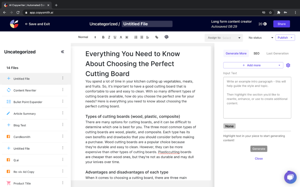 Copysmith focuses on consistency and reliability. Its outputs are polished and business-ready, particularly for product-driven and SEO-heavy content. Product descriptions, ad campaigns, and meta tags come out structured and ready to publish. However, compared to Rytr, Copysmith can feel more rigid and less creative in narrative writing or storytelling use cases. It prioritizes reliability over flair — which is exactly what agencies and ecommerce teams need.