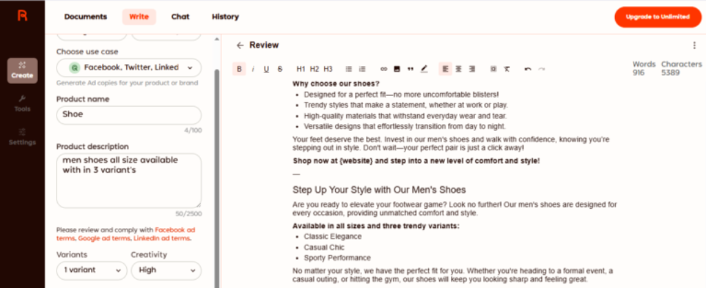 Rytr focuses on versatility and speed. With over 40 use cases, it covers everything from emails and blog ideas to song lyrics and story writing. It includes tone customization, plagiarism checking, and a built-in document editor. It is enough for bloggers, marketers, and even hobbyists. However, its feature set is broad but not deeply specialized for ecommerce or team workflows.