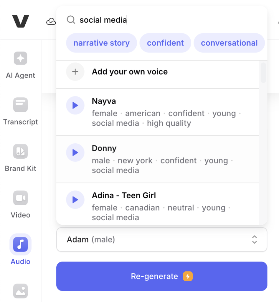 Voice cloning is a strong point for VEED. I tested it with a few recordings, and the cloned voice came through quickly and surprisingly accurate. For creators or brands looking for a consistent voice identity, this is a big plus compared to Canva or simpler TTS tools.