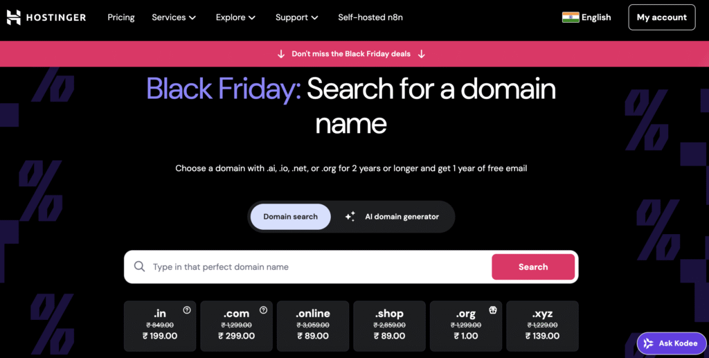 Hostinger is primarily a hosting company, but its domain offering is tightly integrated. If you’re starting a brand-new site and need both hosting and a domain, Hostinger can be one of the cheapest and simplest ways to get going.