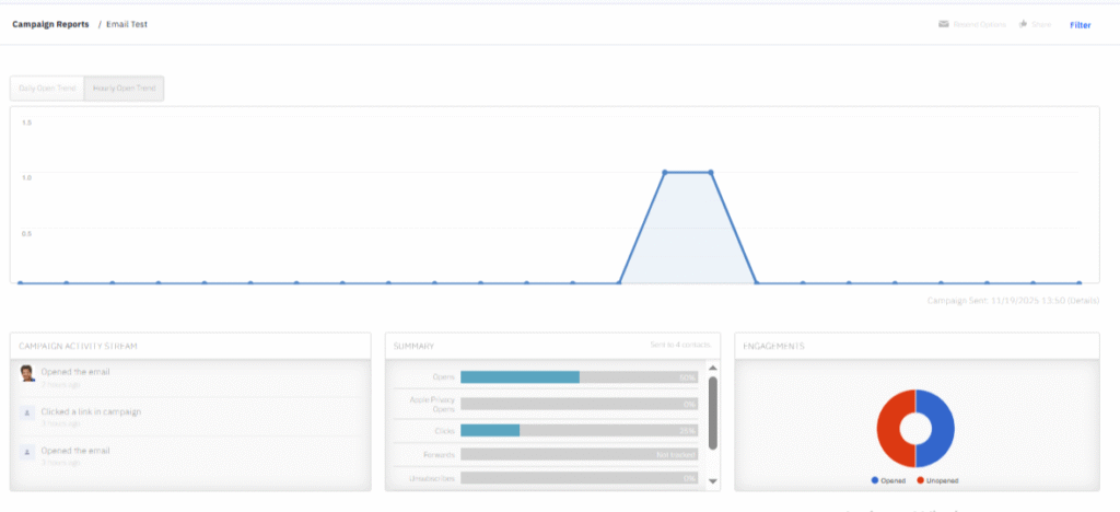 ActiveCampaign’s analytics dashboard provides metrics like opens, clicks, unsubscribes, and geolocation insights in a refined, easy-to-interpret layout. Link tracking displays high-value URLs clearly, and engagement reporting supports informed adjustments. Export options allow marketers to examine campaign-level data in detail.