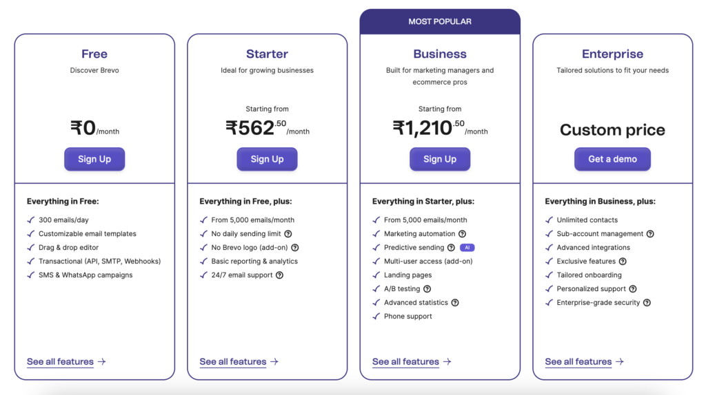 Brevo is a full-fledged communication platform designed for growing businesses. With email, SMS, WhatsApp, chat, CRM, and automation in one dashboard, Brevo helps users manage customer relationships holistically. Its biggest strength is multichannel marketing at an affordable price, with pay-as-you-go options. Whether you’re nurturing leads, sending transactional emails, or launching campaigns, Brevo offers flexibility and reach beyond inboxes.