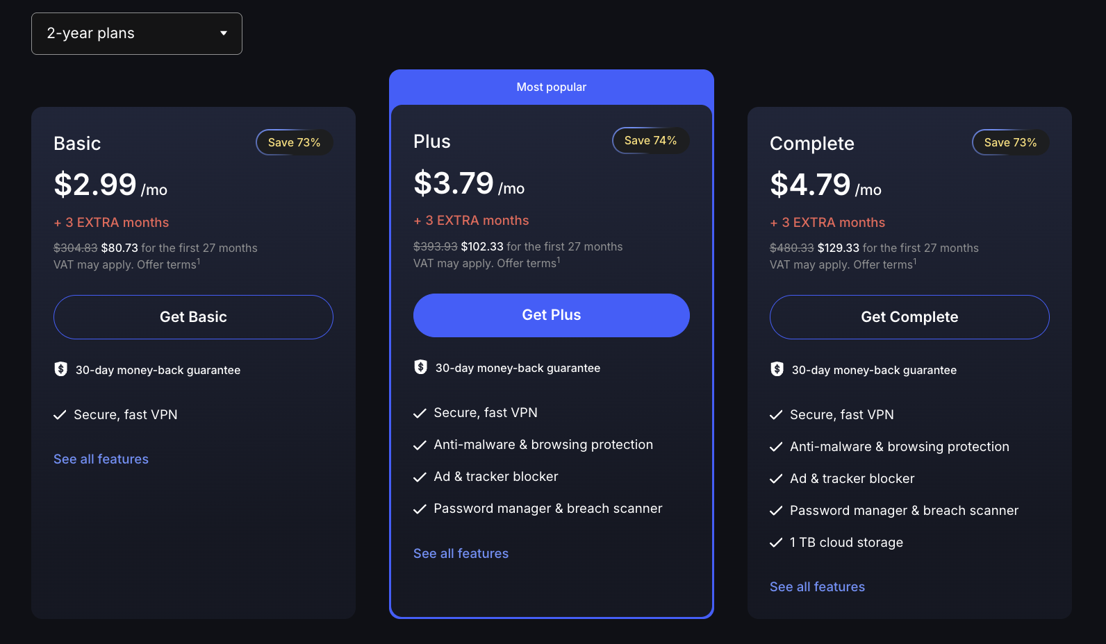 - Complete plan, priced at ₹425 per month on a 2-year term, includes everything in Plus plus encrypted cloud storage and identity-theft protection, making it best for families, small teams, or anyone seeking an all-in-one privacy suite.