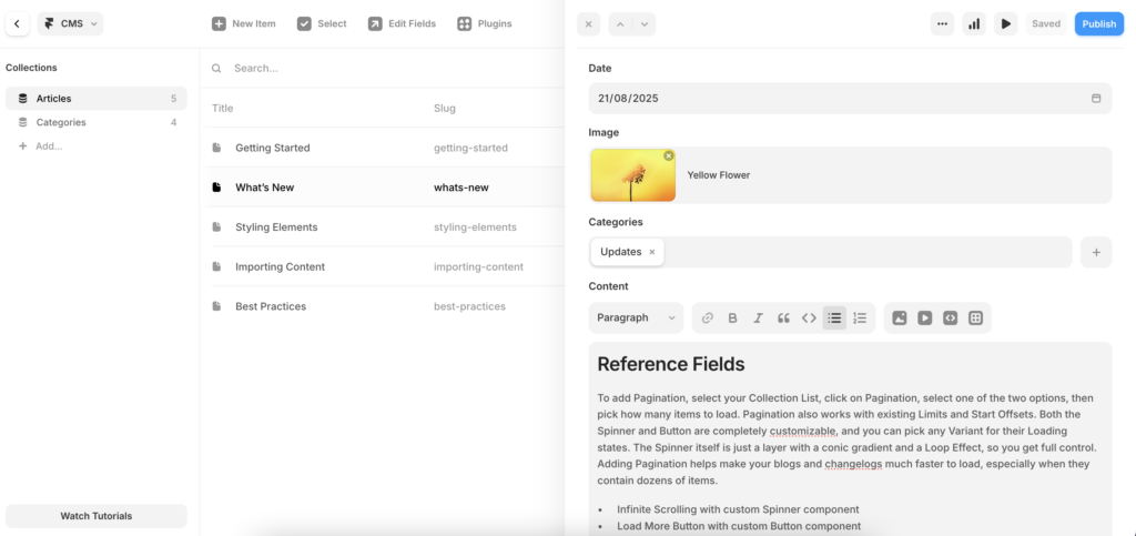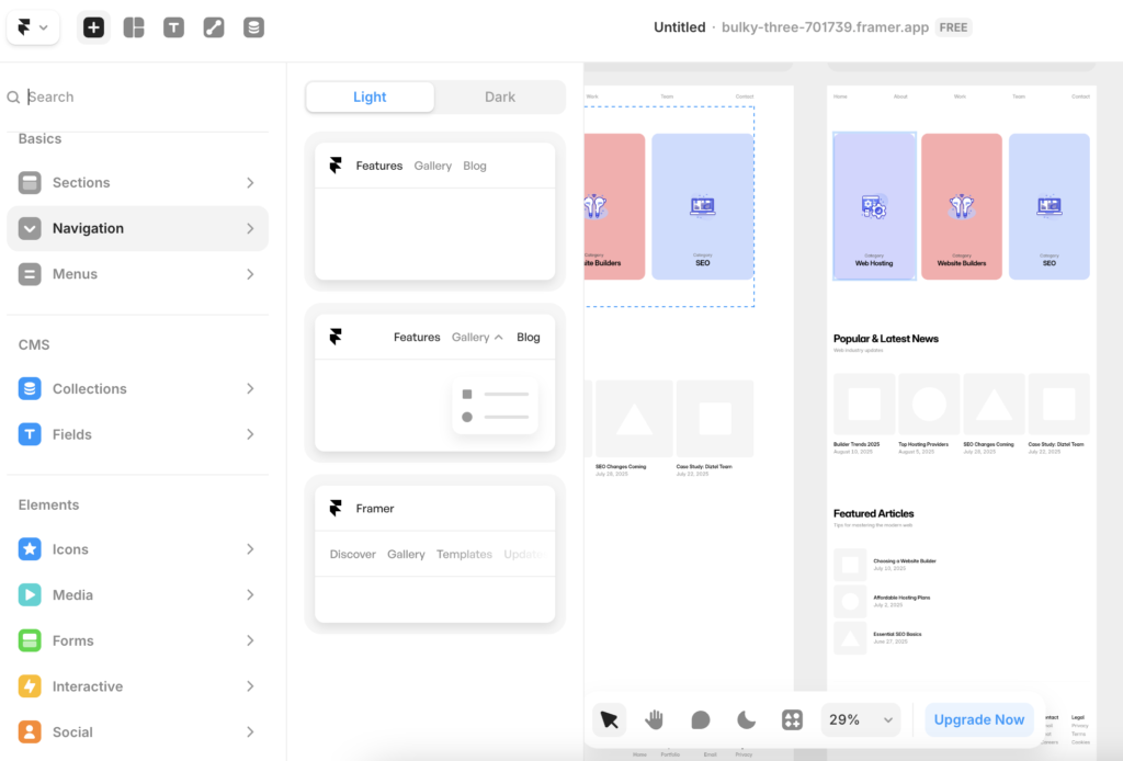 - Framer integrates a visual CMS, allowing creators to connect pages, blogs, or portfolios to dynamic content.