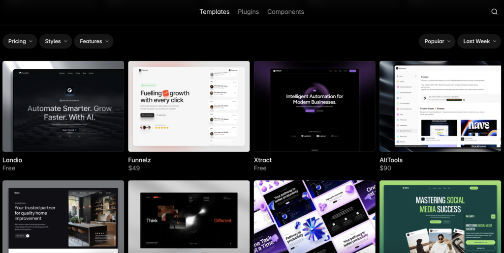 When I first browsed through Framer’s templates, I was impressed by both the variety and polish. There are over 100+ professionally designed templates covering portfolios, landing pages, and business sites. Each template looks modern, clean, and ready to use. No template feels outdated or generic like on some other platforms.