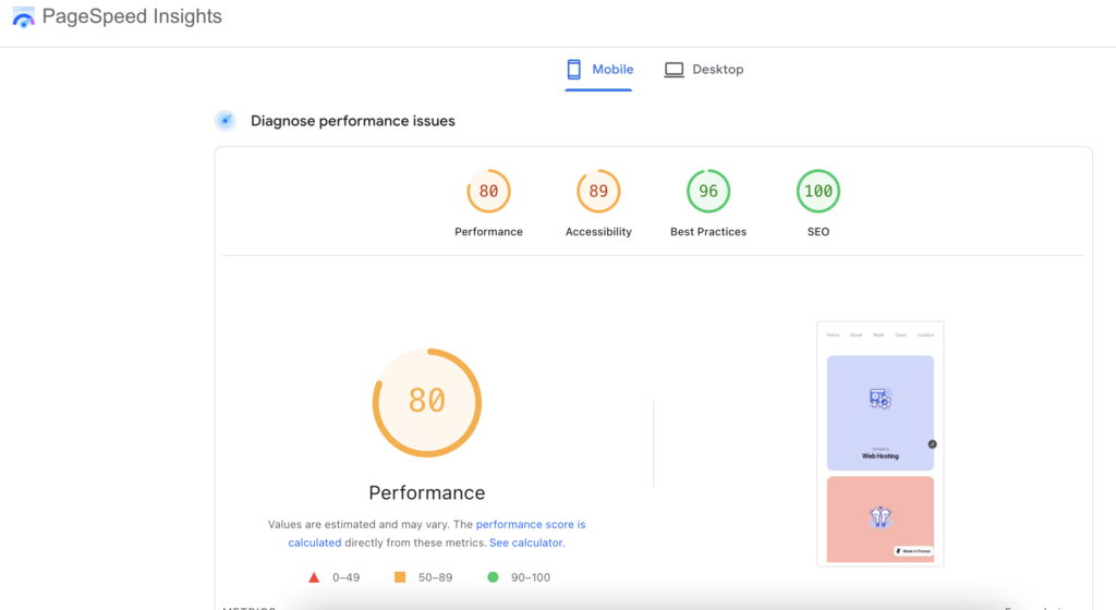 With an SEO score of 100 and Best Practices at 96, Framer nails the fundamentals. The only area to improve is Performance (80), which is good but leaves room for further optimization. For freelancers or small businesses, these scores mean your site will load fast, rank well, and remain secure without extra setup.